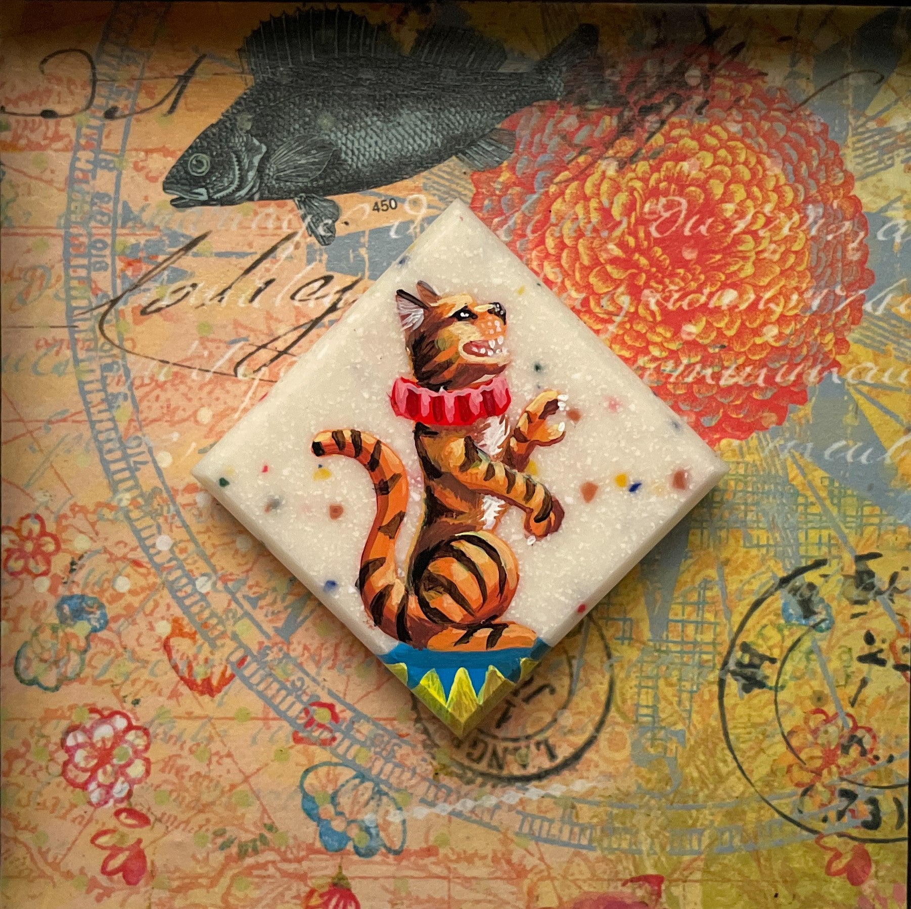 This original painting is done on an acrylic tile sample and mounted to a hand decorated wooden frame.